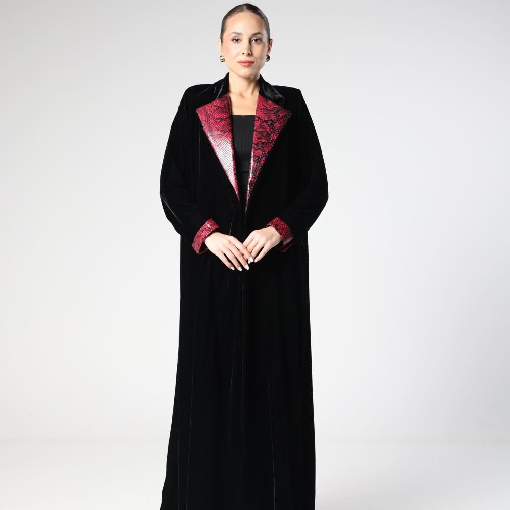 قماش العباية : مخمل كـوري فاخر باللون الأسود ، مضاف اليه جلد طبيعي باللون العودي كتدخيله على الاكمام والياقة الأمامية