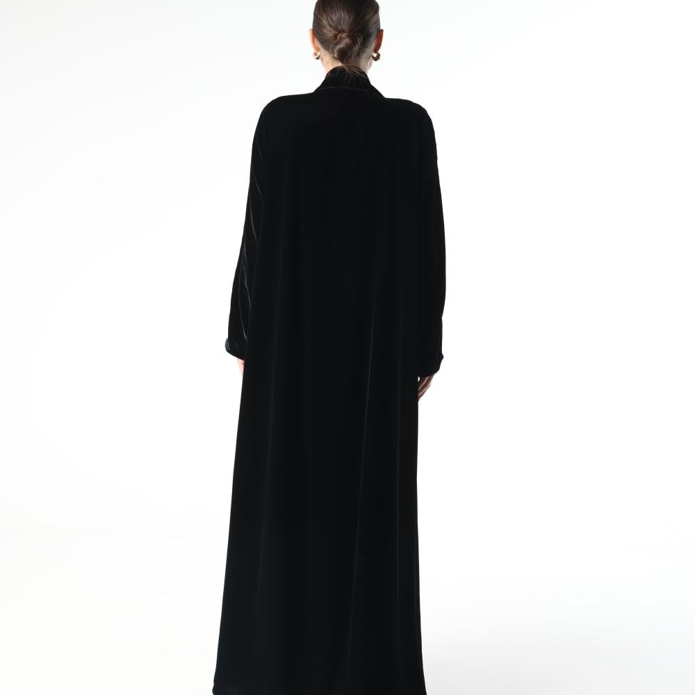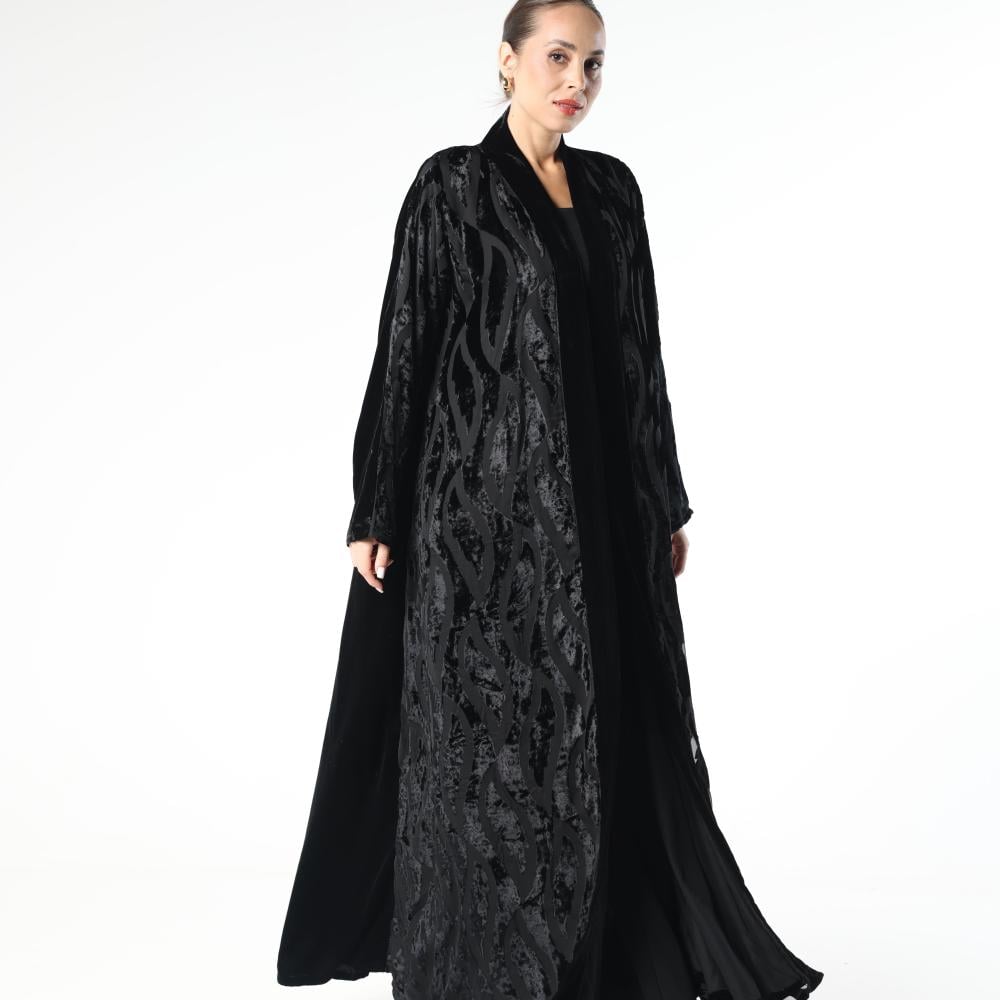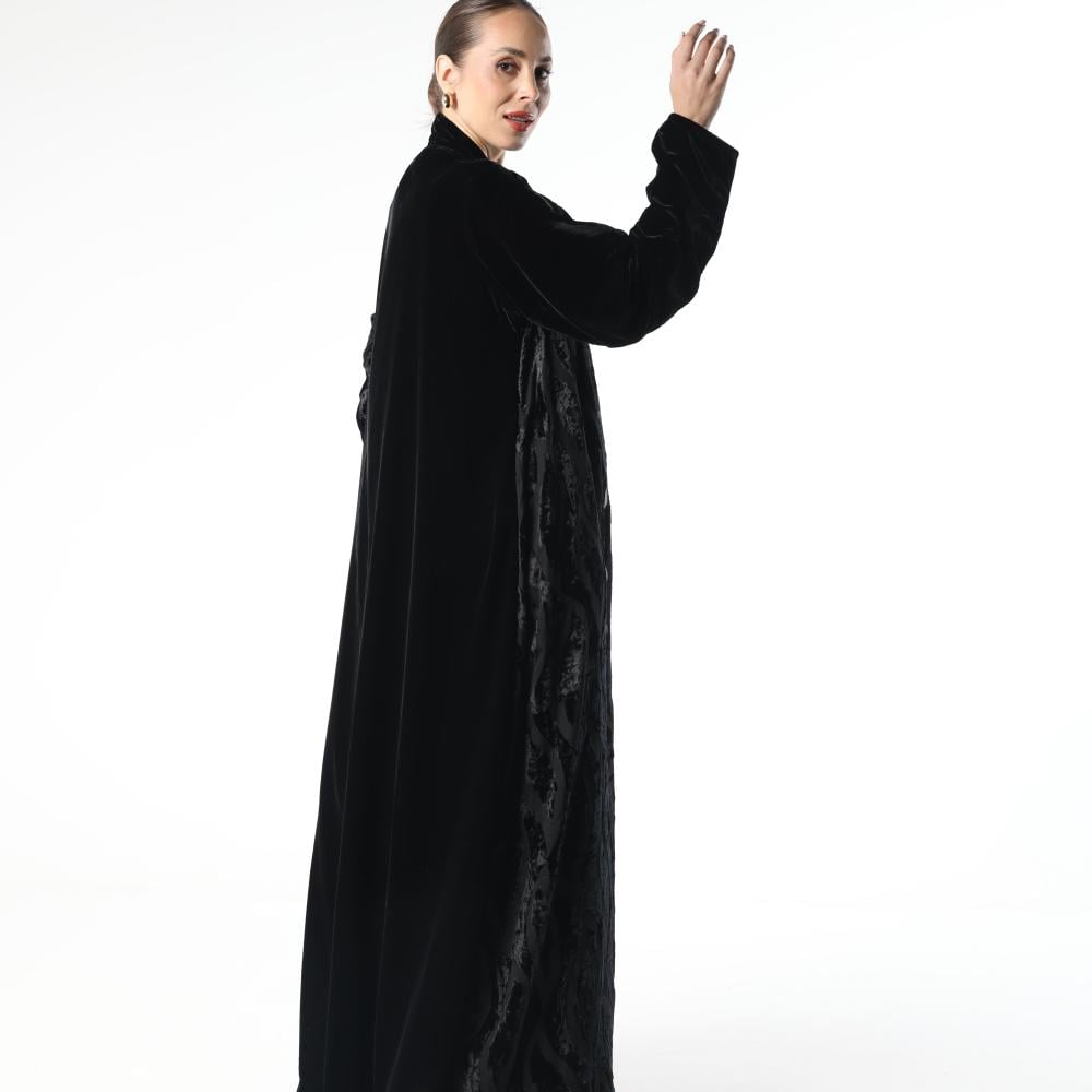 • قصة كلوش من الأمام شيفون مشجر مبطن بمخمل اسود من الخلف مخمل اسود سادة